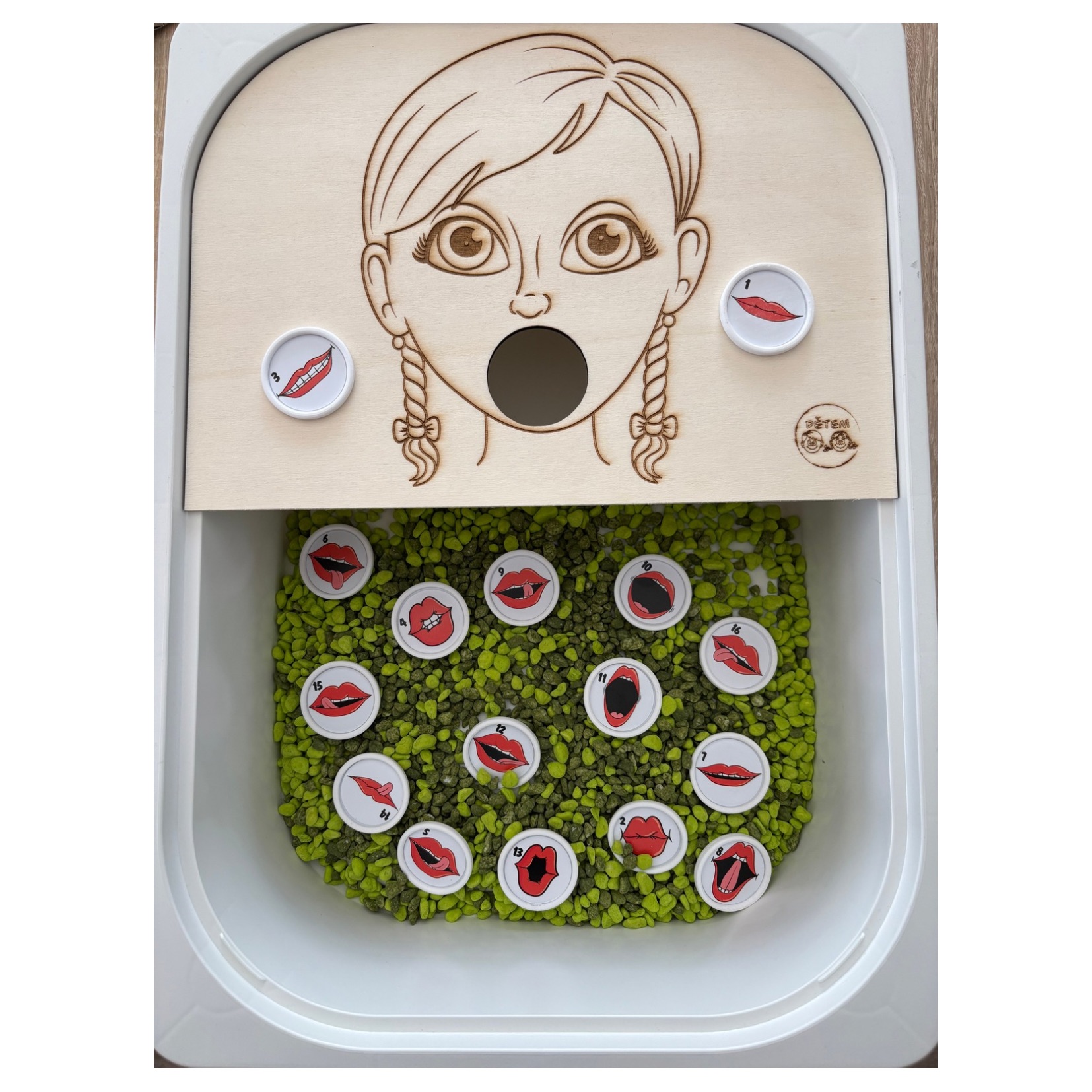 Dřevěná deska s dívkou vhodná pro senzorické (smyslové) hraní pro vložení do velkého Trofast boxu z IKEA. Děti vhazují žetony do pusy a předvedou cvik podle přiloženého manuálu, který dostanete v podobě pdf na email (ŽETONY NUTNÉ KOUPIT ZVLÁŠŤ!!! NEJSOU SOUČÁSTÍ DESKY)